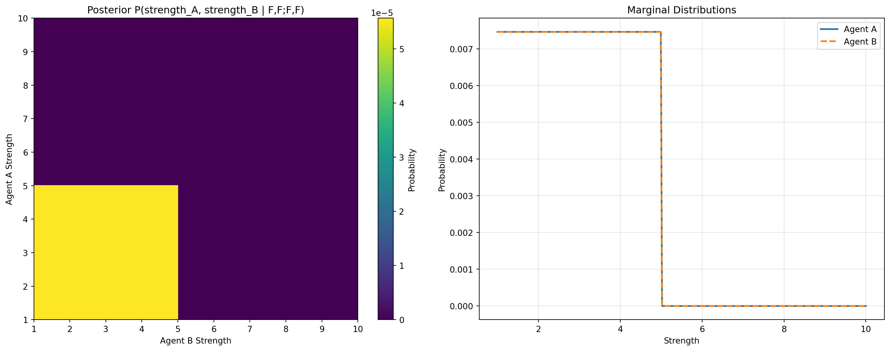 Key insight: The game-theoretic reasoning operates on expected utilities over the posterior distribution of strengths. This is not purely probabilistic reasoning (like the inference above), but rather decision-theoretic optimization under uncertainty.